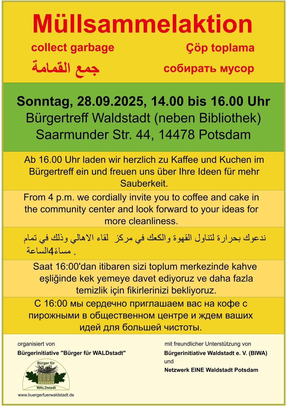 Wir laden wieder zu einer Müllsammelaktion am 28.09.2025, 14.00 bis 16.00 Uhr im Zentrum von Waldstadt ein.